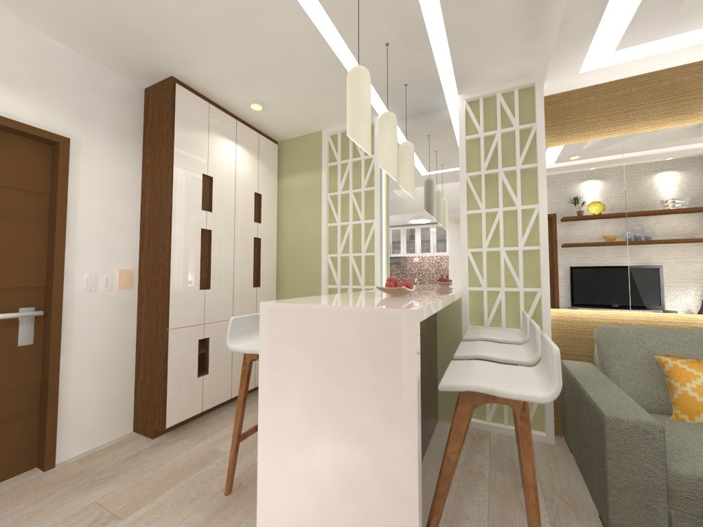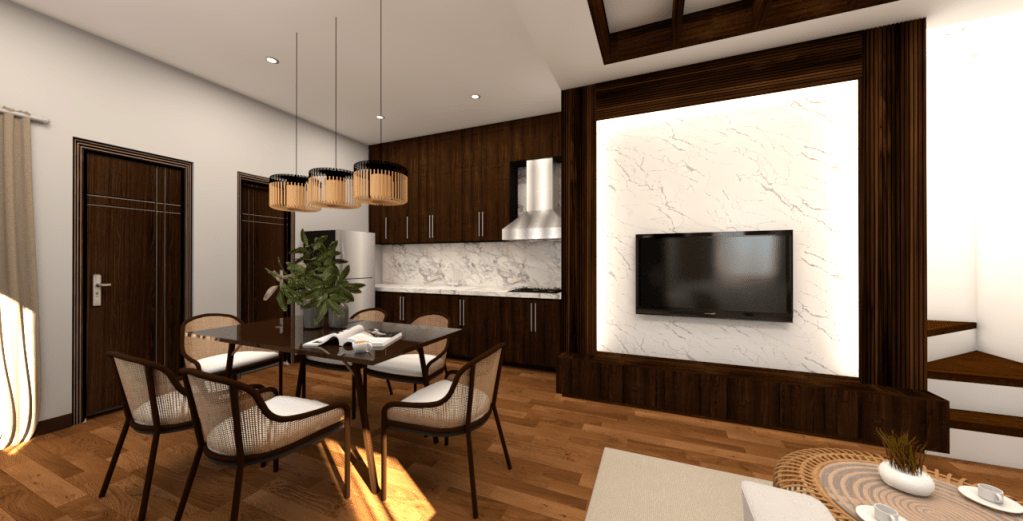 The concept excels at creating a sense of spaciousness and warmth in a compact environment. The continuous use of light wood and built-in storage draws the eye upward and maintains a consistent, cohesive flow between the kitchen, dining, and living zones.