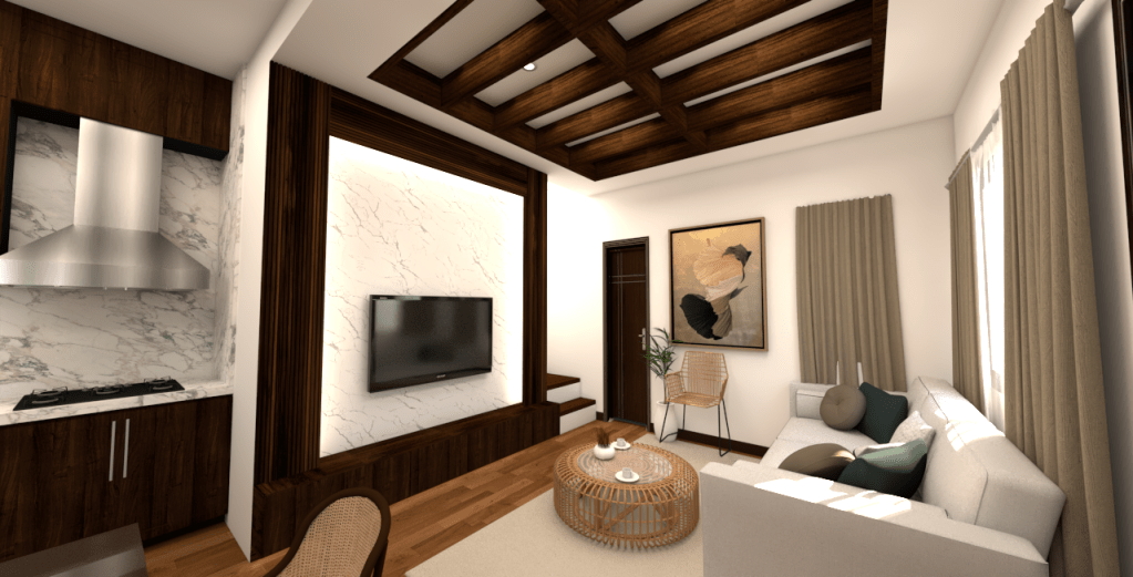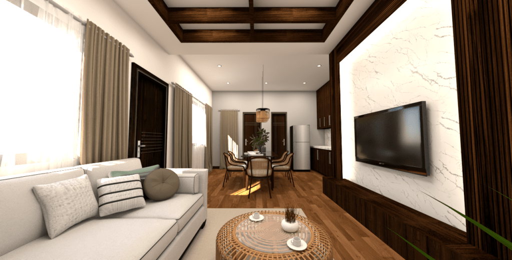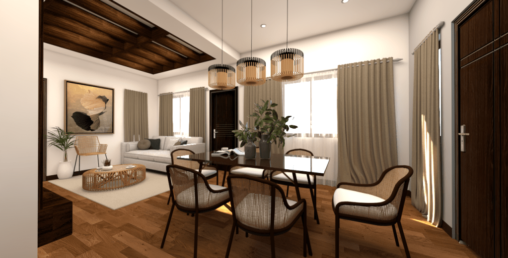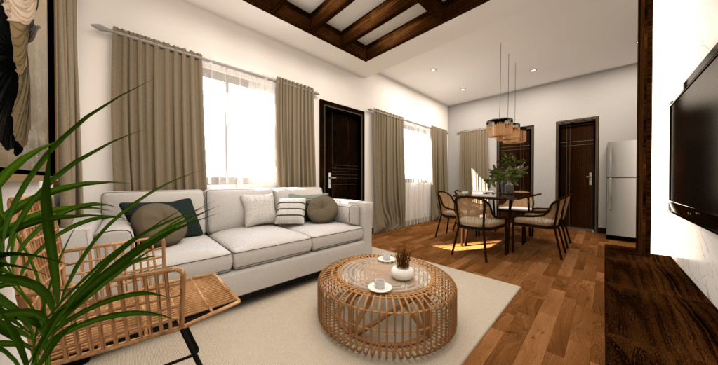 This design concept blends the warmth and texture of tropical aesthetics with the clean lines and functionality of modern design, creating an inviting, sophisticated, and earthy sanctuary.